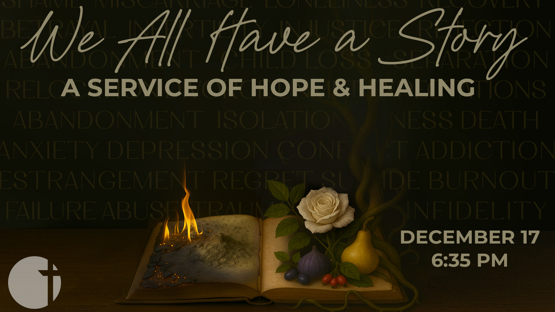 Join us for an annual service held during the holiday season to recognize that, while this time often celebrates joy and hope, it can also highlight our losses and grief. We all have a story—and that story matters. Whatever you are carrying, this is a safe space to name your pain, remember what’s been lost, surrender your story, and trust that God can still redeem all things. Join us for worship, candle lighting, and a time to let God meet us in the middle of our grief story. Come early for a free dinner served 5:30-6:20PM.