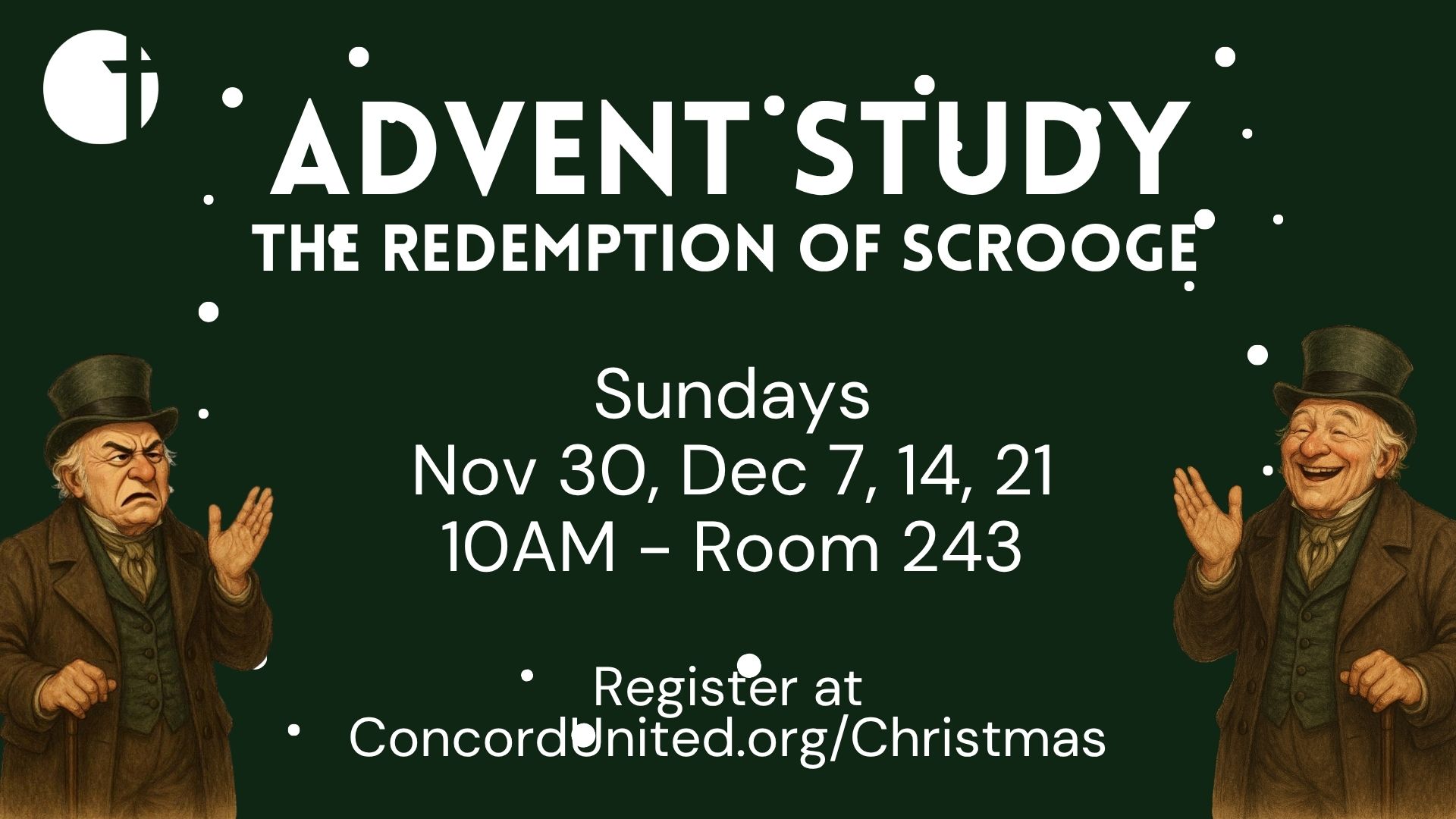 One way to engage with God this Advent season is through a study of Matt Rawle’s book, The Redemption of Scrooge. This resource parallels Concord’s sermon series content. Along with Ebenezer Scrooge, we meet the Ghosts of Christmas Past, Present, and Future and in the process learn about living with and for others in a world blessed by Jesus. Rediscover and reinvigorate your Christian faith this Advent and Christmas season and look at this familiar classic through the lens of faith!